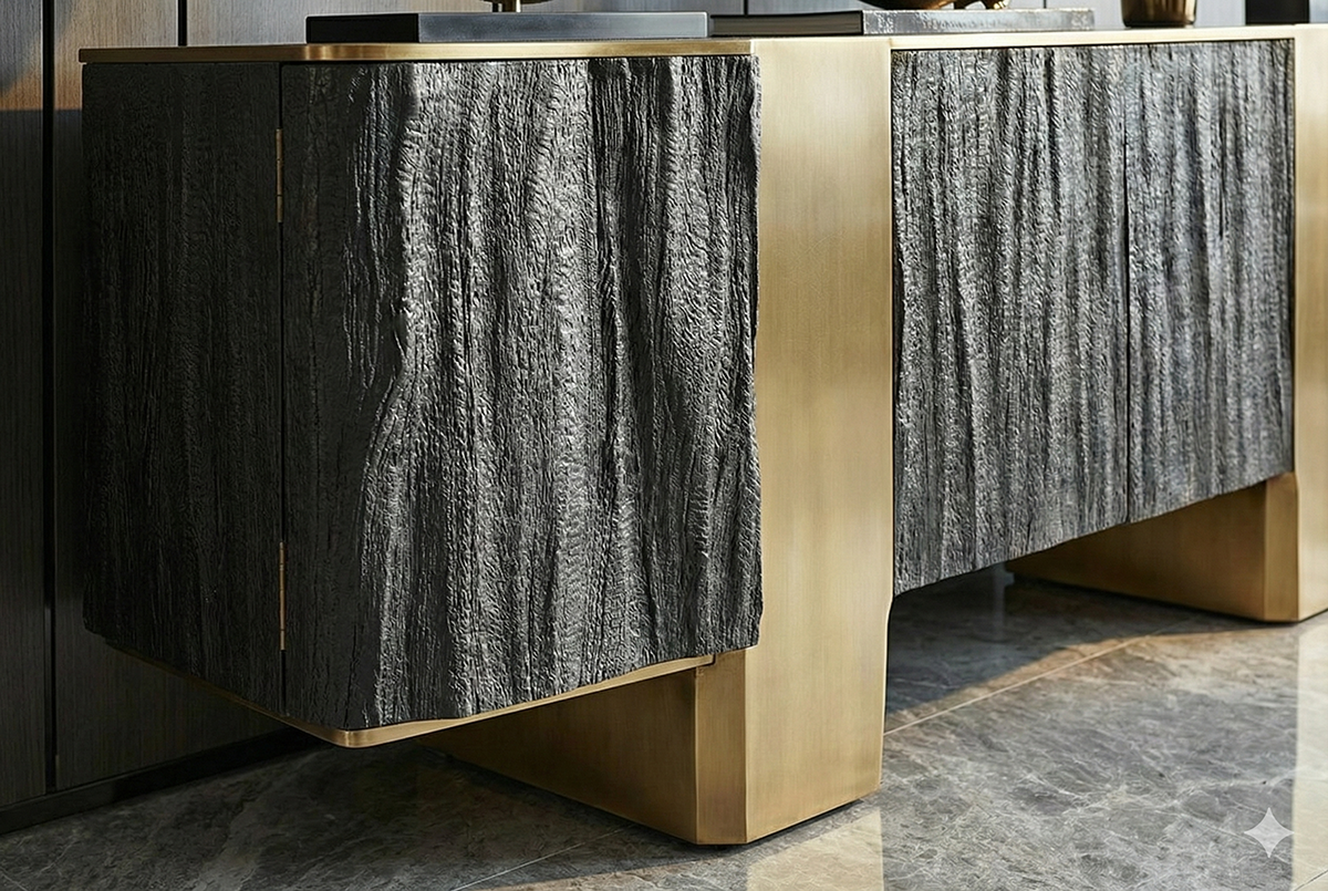 Combination of brushed steel, premium veneer, and marble-top finish.