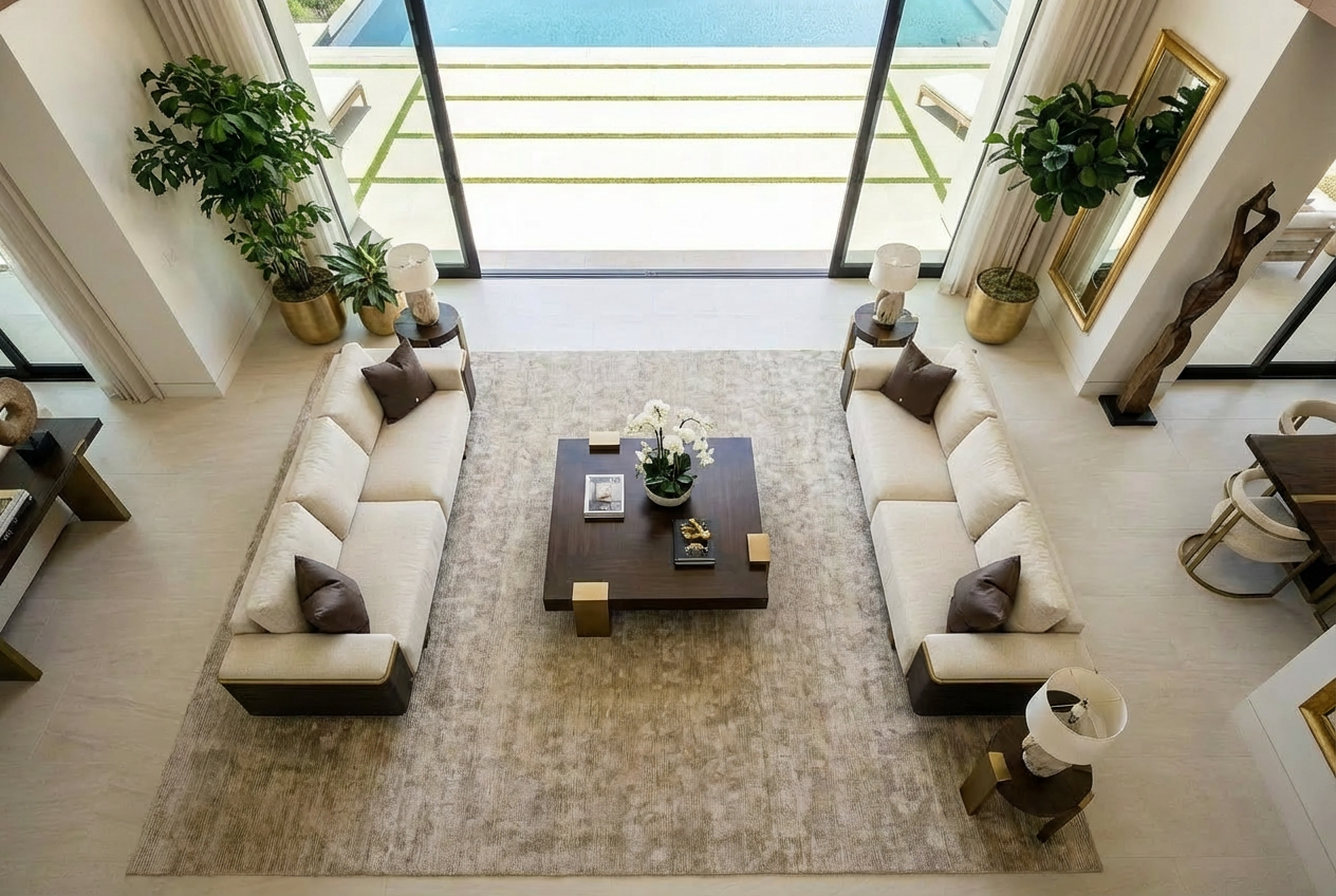 Sandy beige with brown cushions and wood tone accents. Customisable following the client’s request.