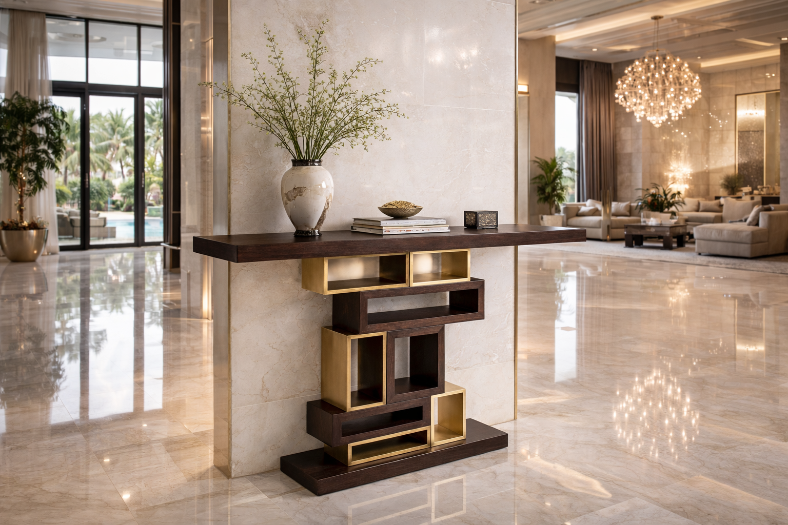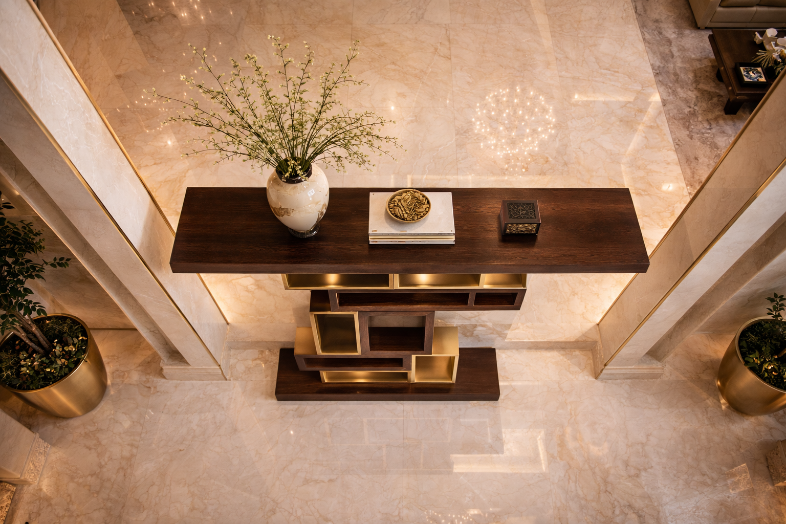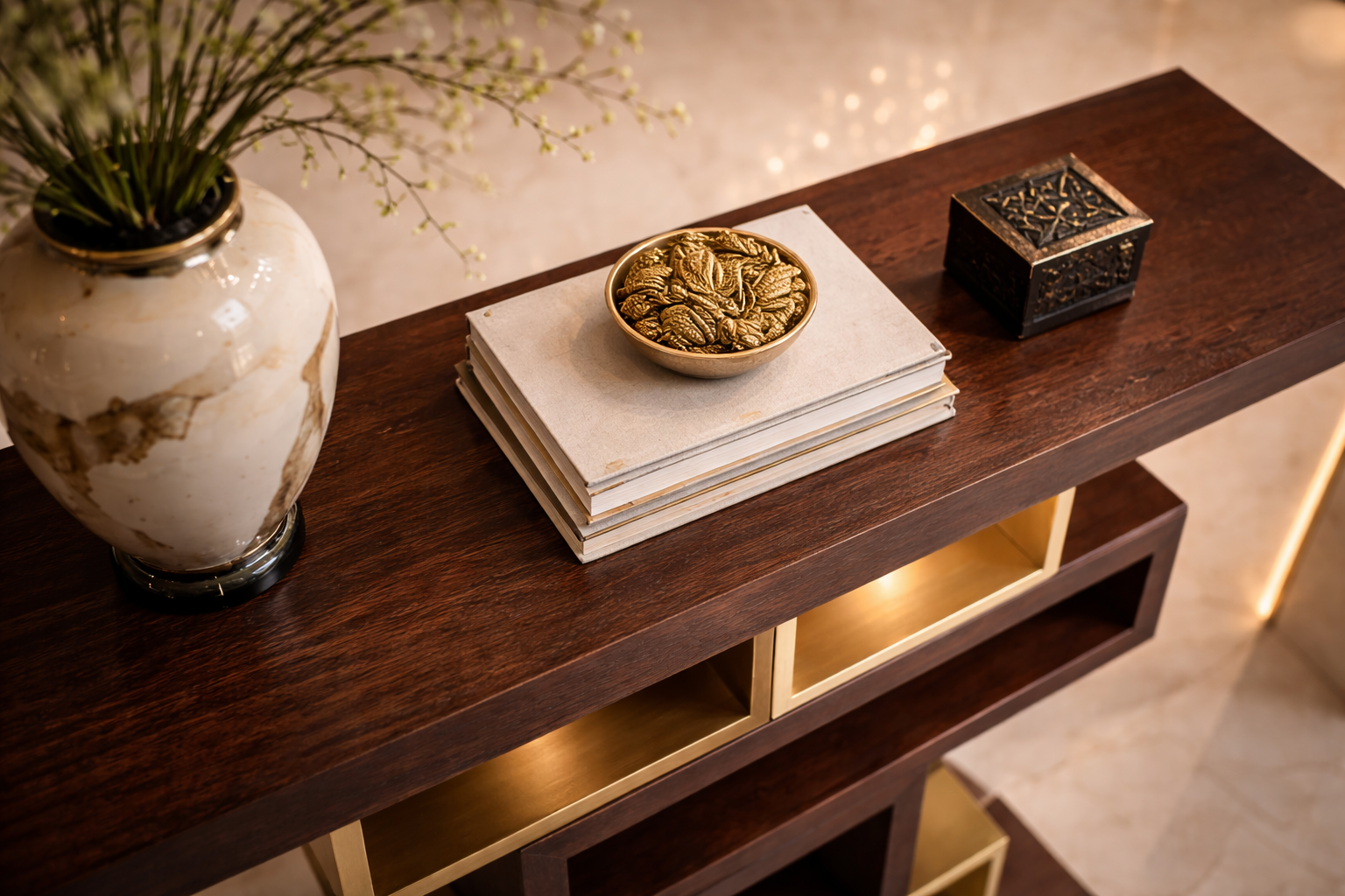 Dark wood paired with gold-toned structural elements for a grounded yet luxurious effect.