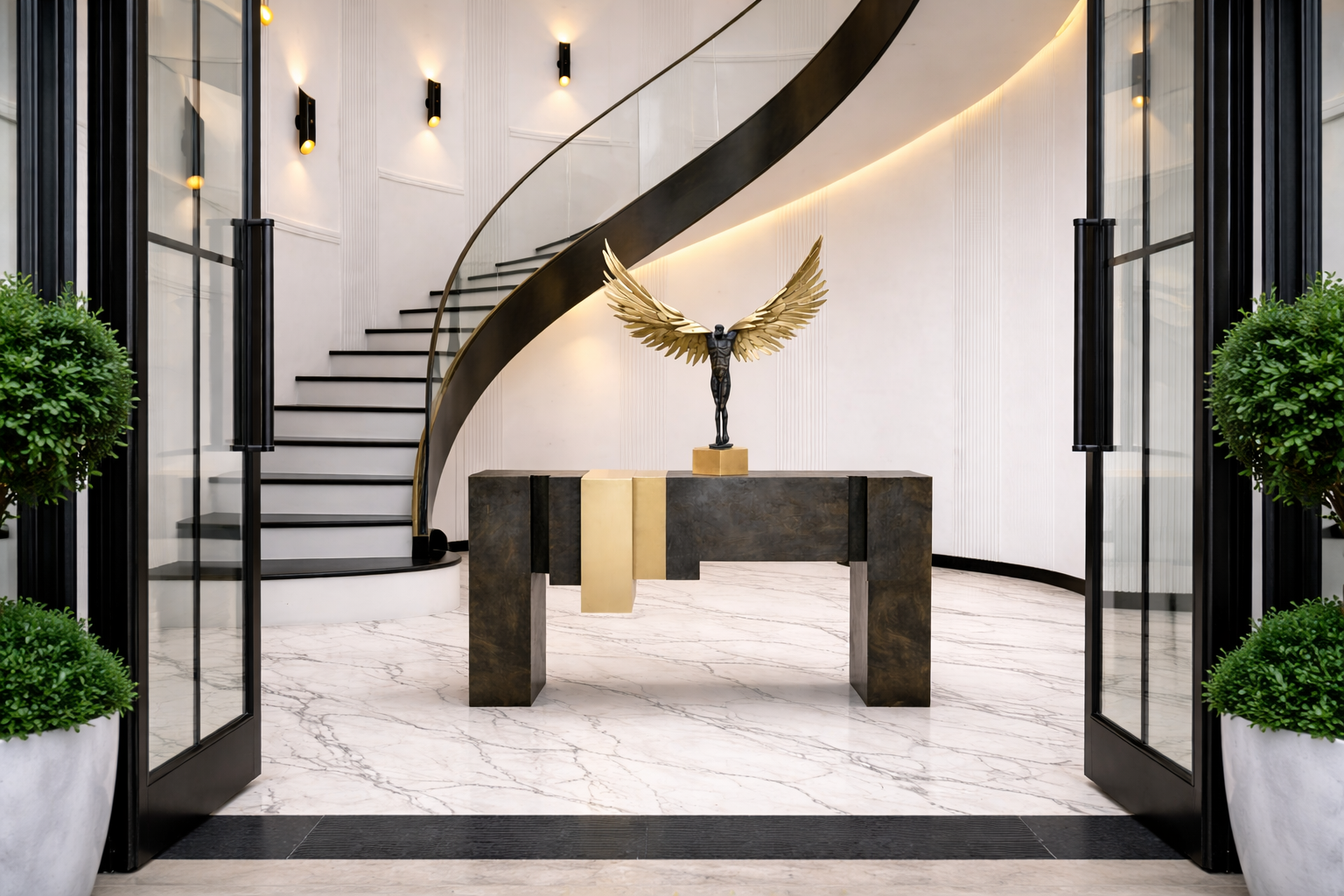 A dramatic interplay of dark metal and gold, the Goldline Console glimmers like a beam of Italian sunlight breaking through shadow. The central golden plates emerge from the dark structure with luminous contrast. Each layer carries depth, weight, and poetry. A bold sculptural accent for refined interiors.