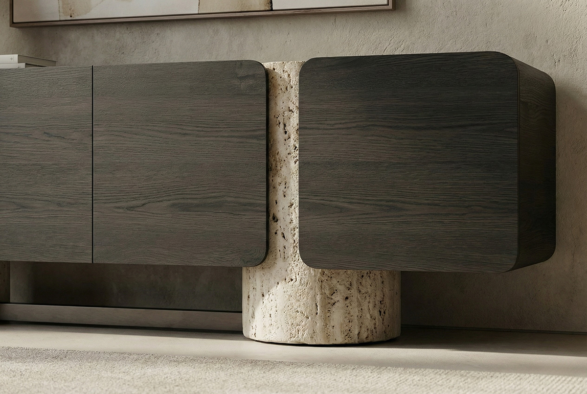 Rounded and serene, this console traces the gentle curves of Italian elegance. Its dark wooden body drifts into a luminous white stone base, as if light were rising softly from the earth. Behind glass doors, a warm golden glow reveals a quiet inner world, subtle, intimate, almost celestial. Modern yet poetic, it feels less like furniture and more like a halo of calm drawn across the room.