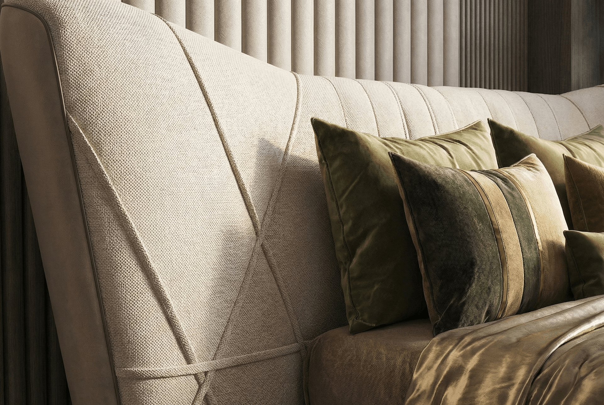 A stage of calm and comfort. The Il Sipario Dream Bed frames sleep with a wide, sculpted headboard and soft vertical rhythm. Upholstery, stitching, and proportion work together to create a composed presence.