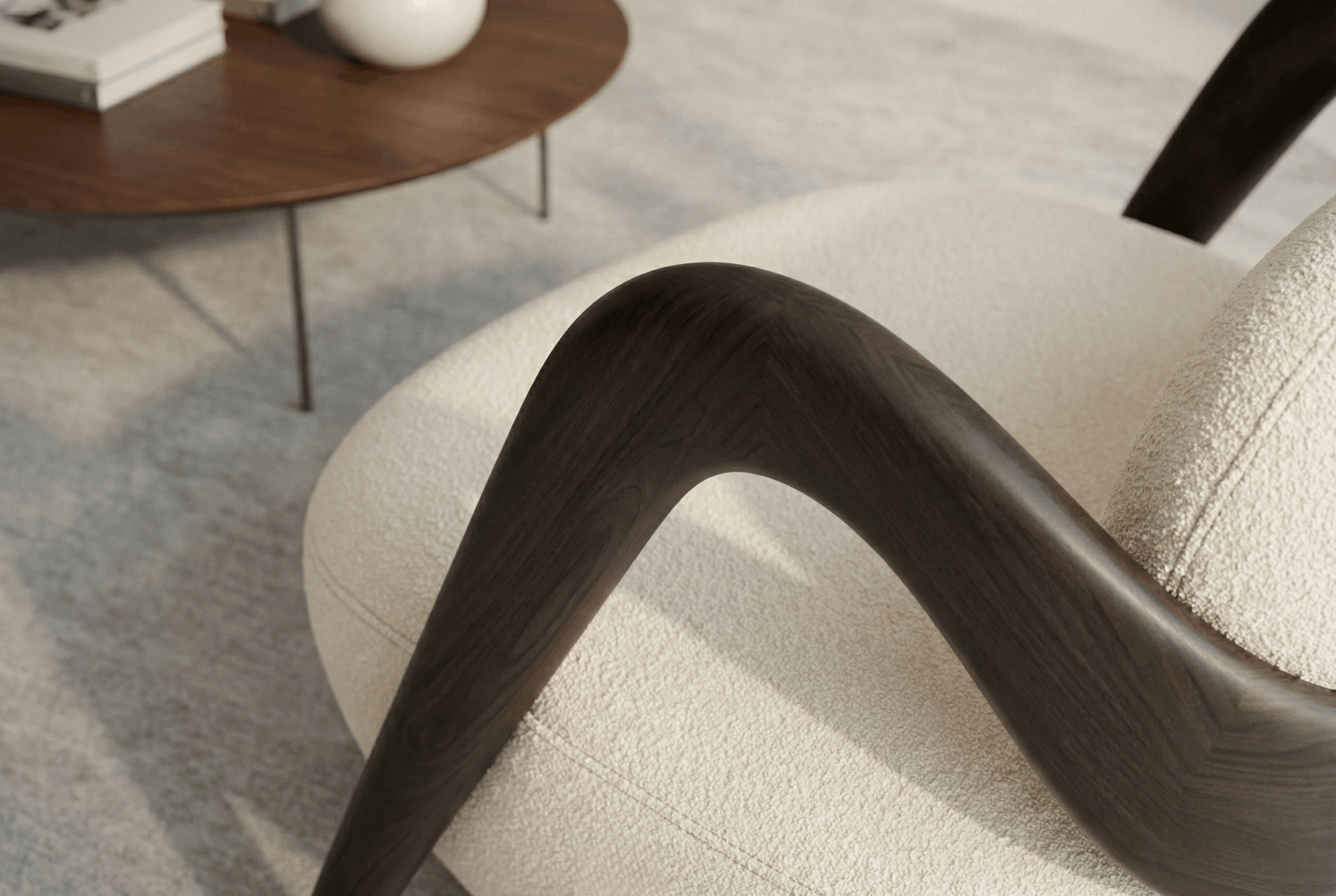 Curved solid wood frame paired with plush Italian fabric for a blend of strength and softness.