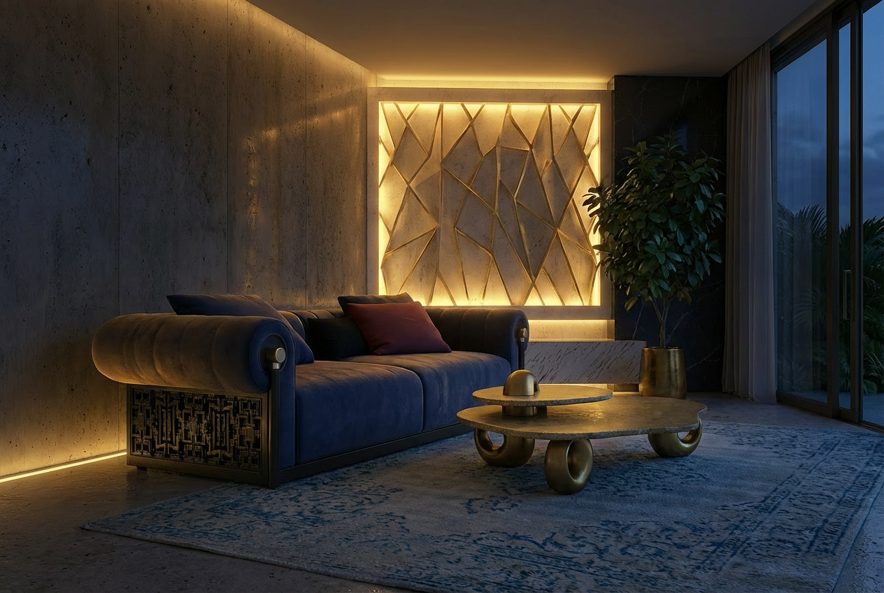 Architectural depth with refined character. The Notte Intarsio Sofa pairs deep, structured upholstery with carved wooden side panels, creating a piece that feels composed, intimate, and visually rich. Its design balances softness with precision, anchored by graphic detailing and subtle metal accents.