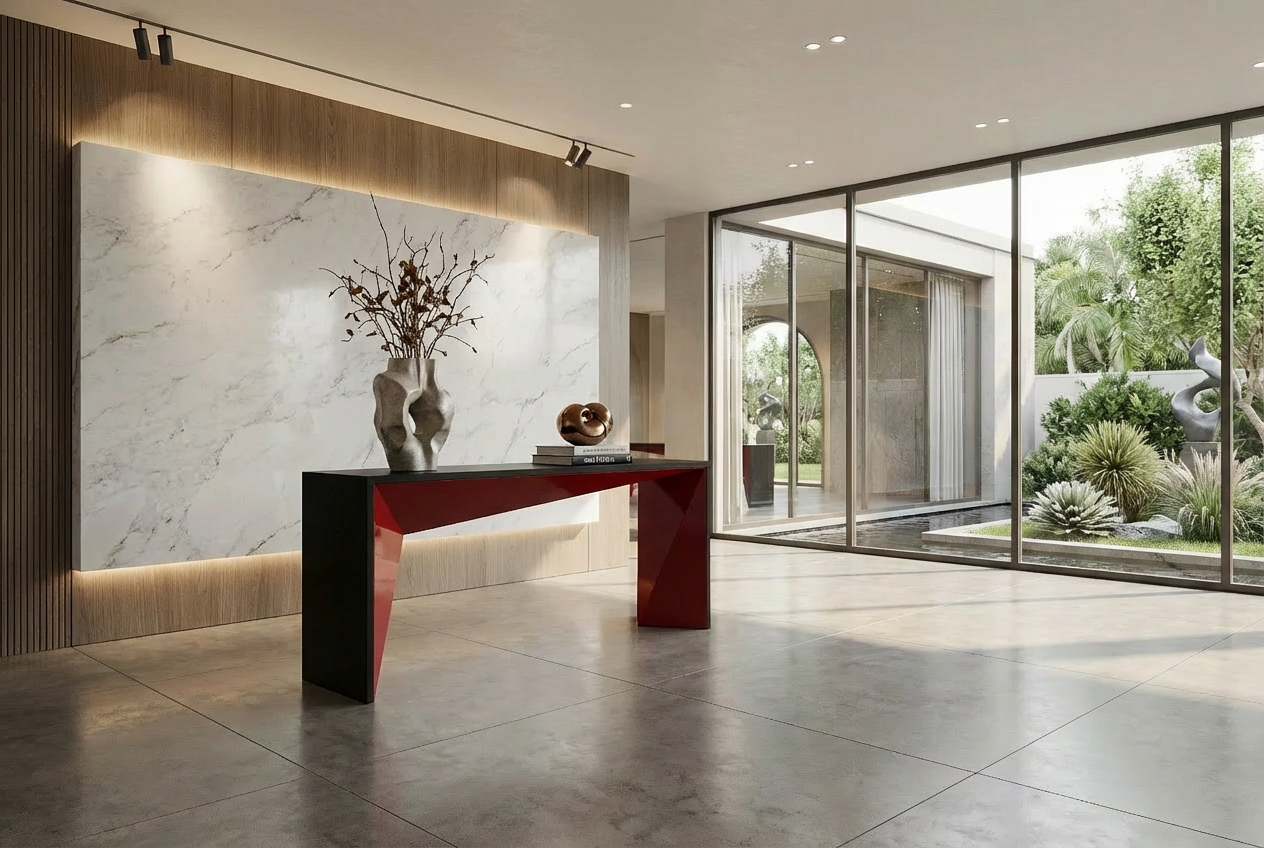 Sharp, bold, and impossibly sleek, the Milano Shard Console feels like a fragment of an Italian skyline carved into modern art. Its angular red interior glows subtly beneath its dark exterior, creating a dialogue between strength and grace. The structure bends lightly as if caught mid-motion. A minimalist statement with unmistakable Italian flair.