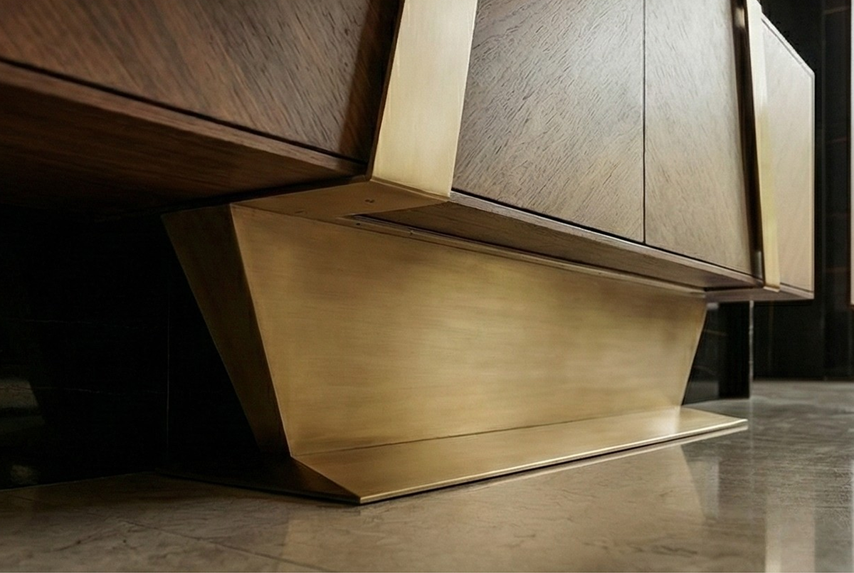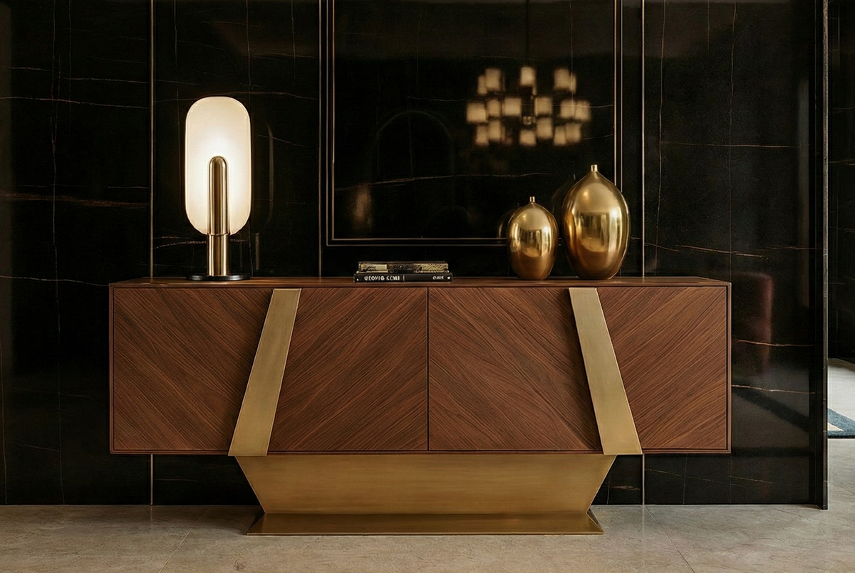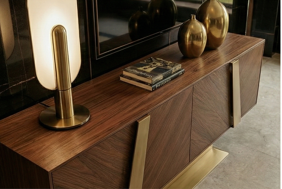 An icon of Italian architecture. The chevron wood pattern and brushed brass details bring timeless sophistication to modern interiors. With generous storage and a robuste silhouette, it combines practicality with refined elegance. Its meticulous craftsmanship and subtle textures make it a statement piece in any living space.