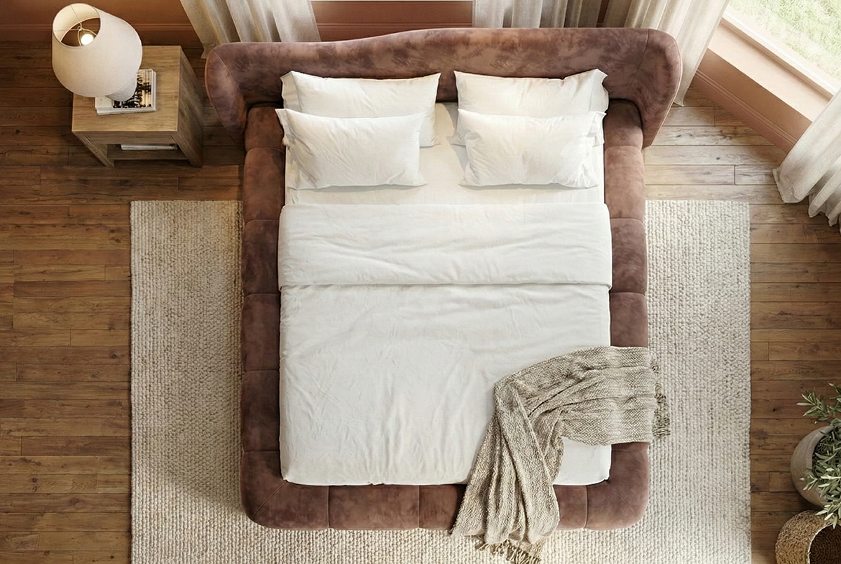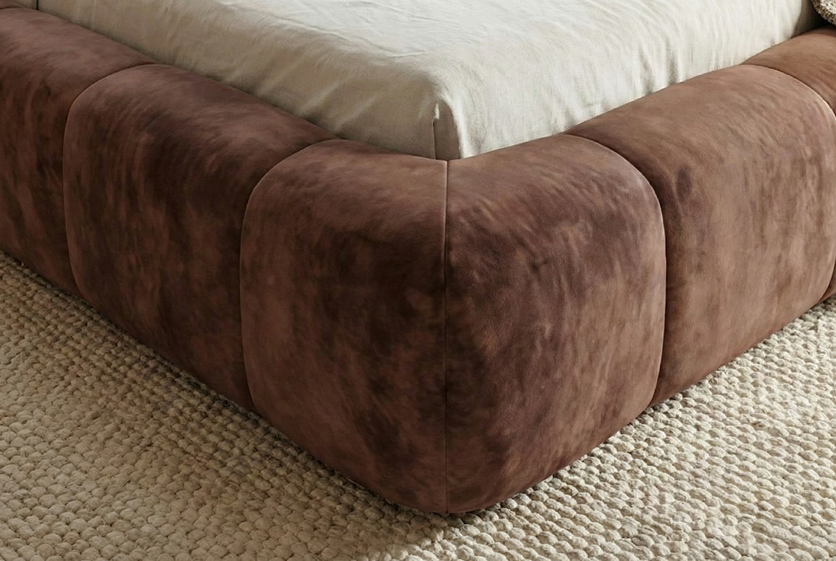 Warmth shaped into rest. The Tuscan Ember Bed features a softly contoured headboard and a low, grounded frame. Upholstery wraps the form with a calm, inviting presence.