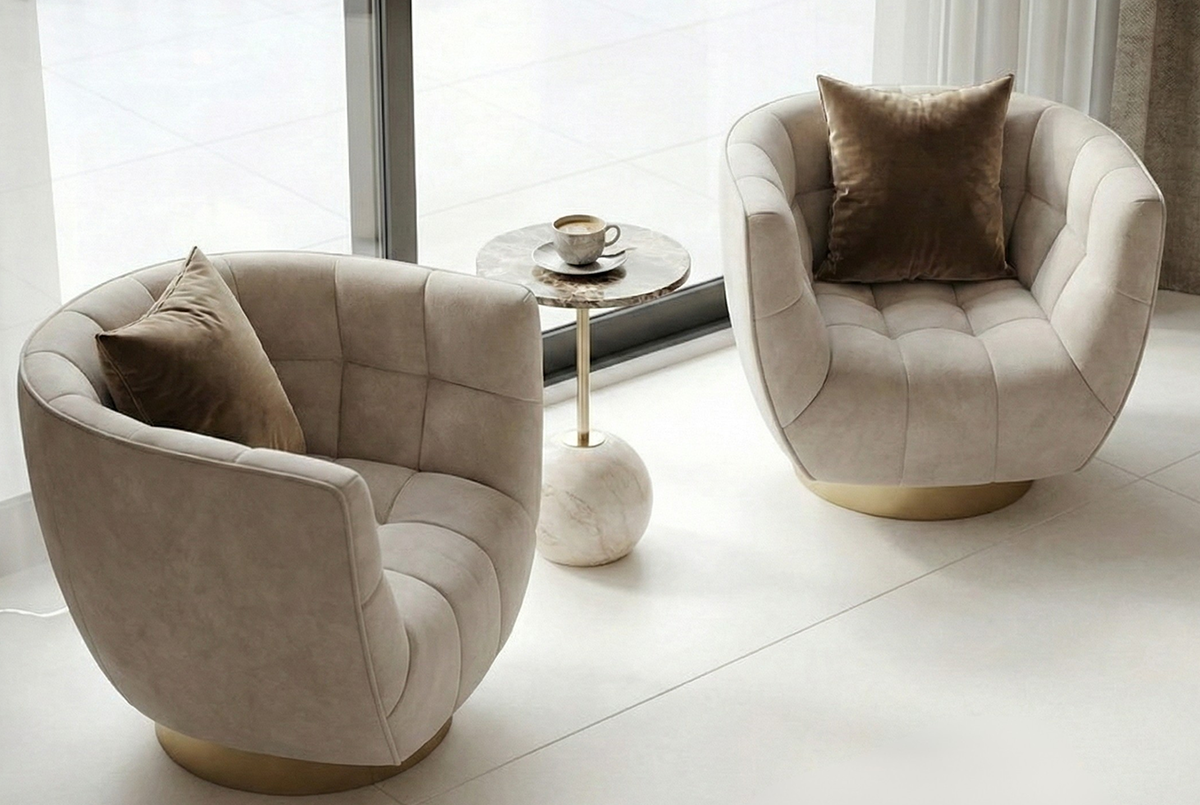 The lounge chairs introduce a quiet seating moment, balancing comfort with compact proportions near natural light.