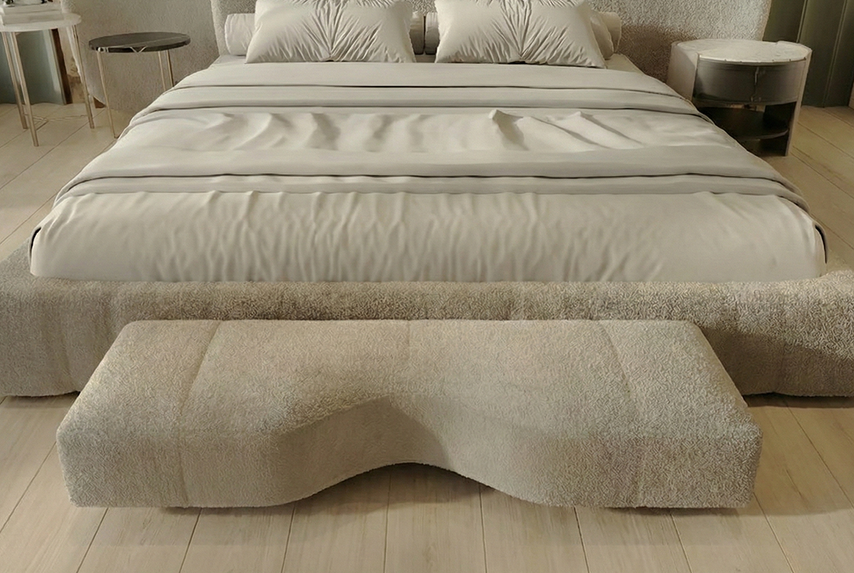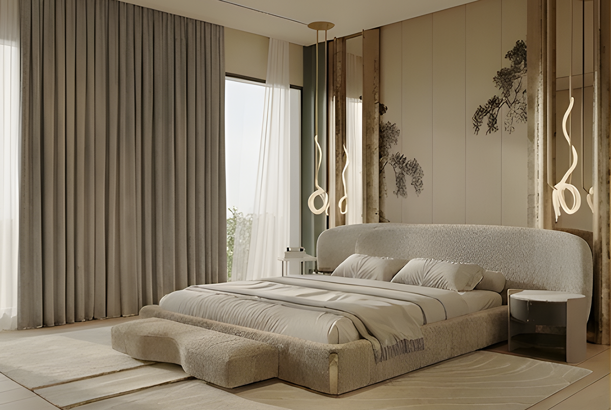 The rounded nightstand reinforces the room’s soft geometry while adding contrast through subtle material shifts and restrained detailing.