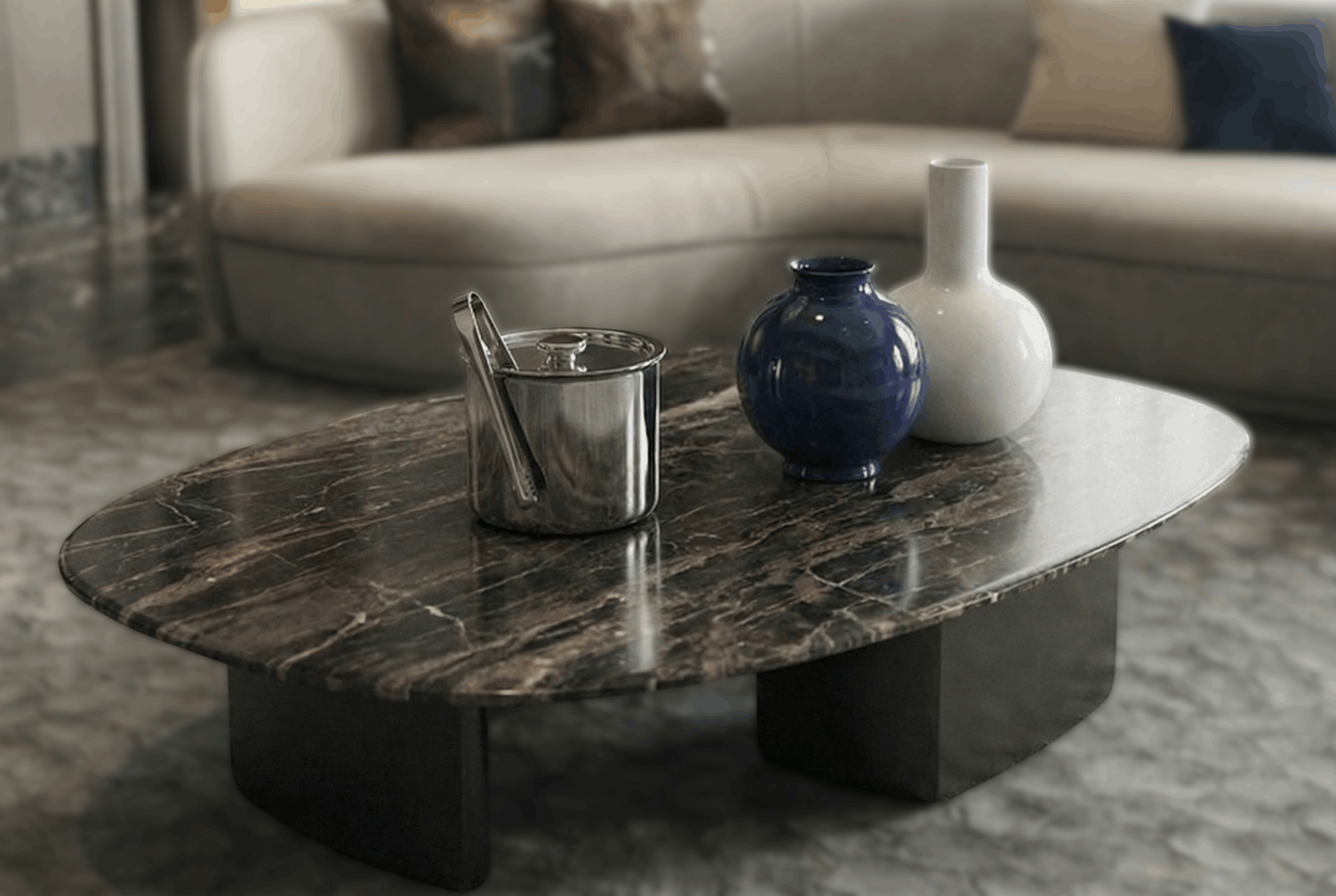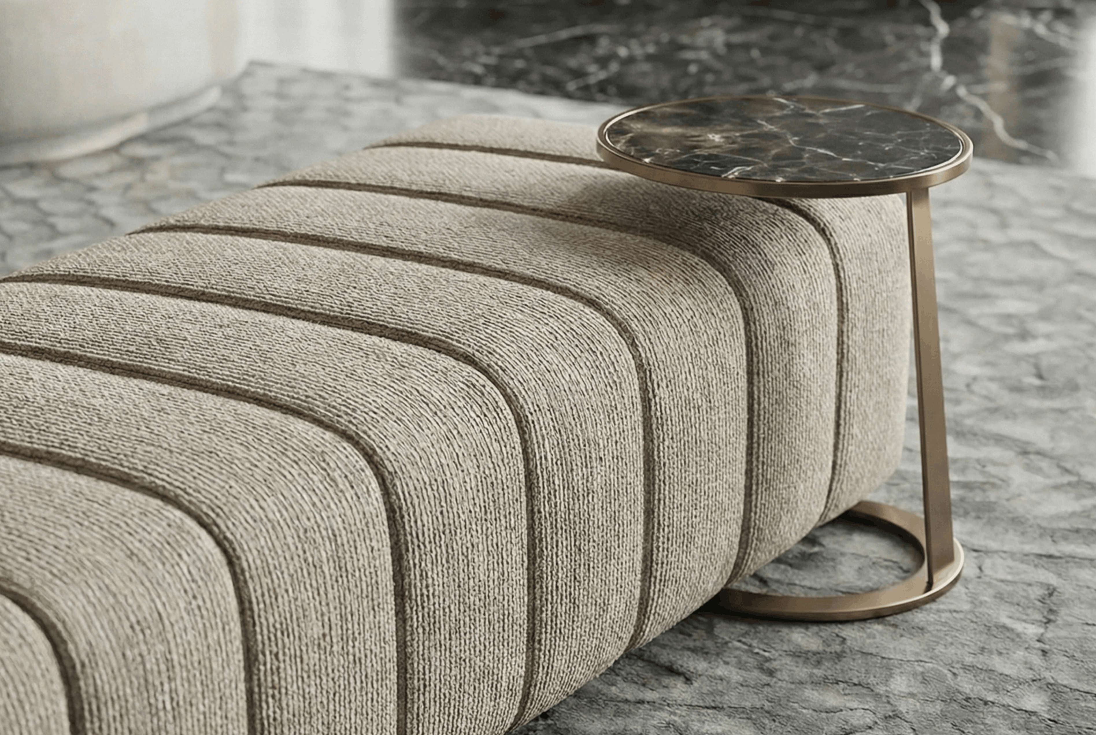 This channel-stitched bench adds structure at the edge of the rug and creates an extra seat without blocking the layout. The integrated side table in metal and stone gives you a clean spot for a drink or a book, right where you need it.