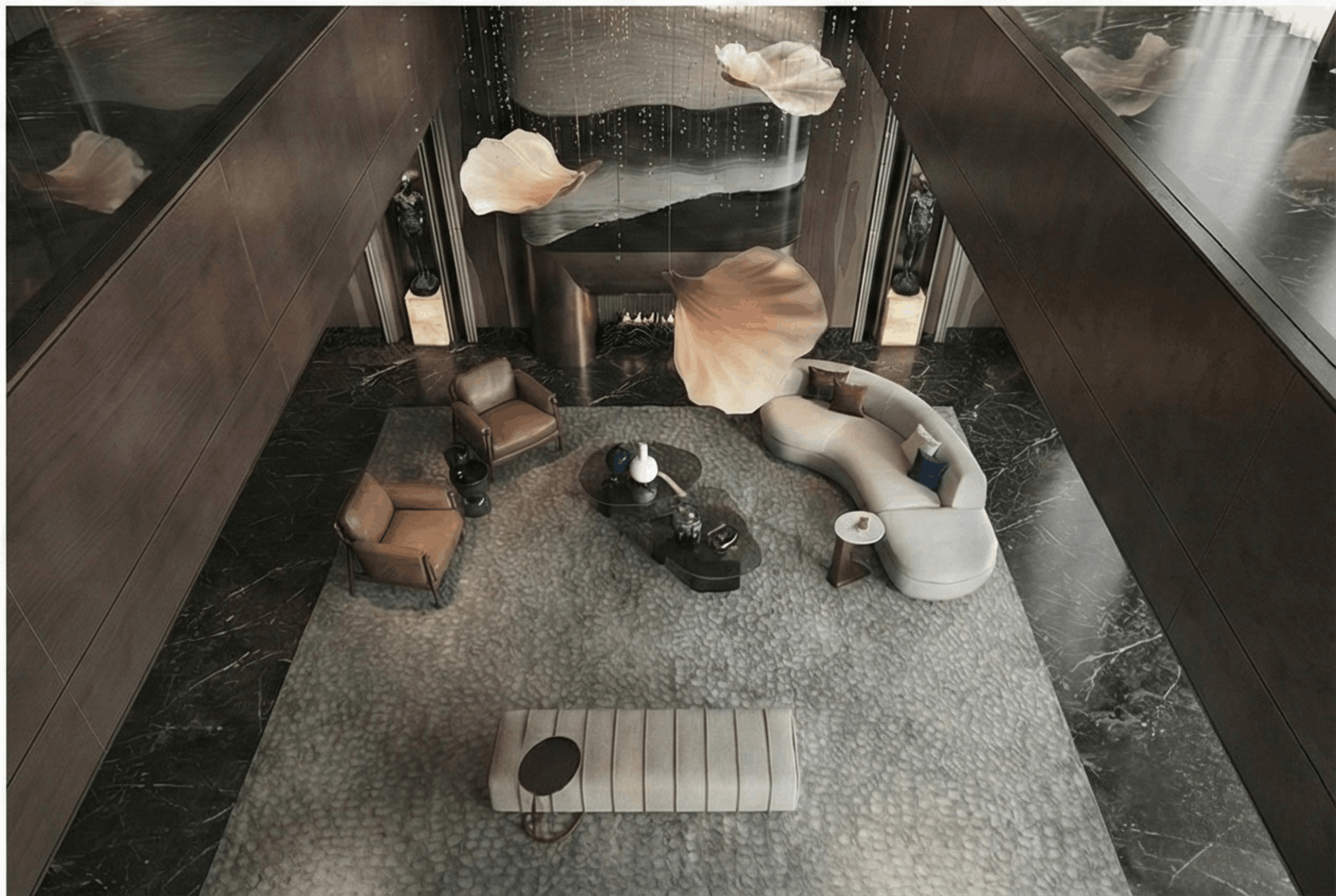 Curved seating and low tables keep sightlines open while pulling everyone toward the fire.