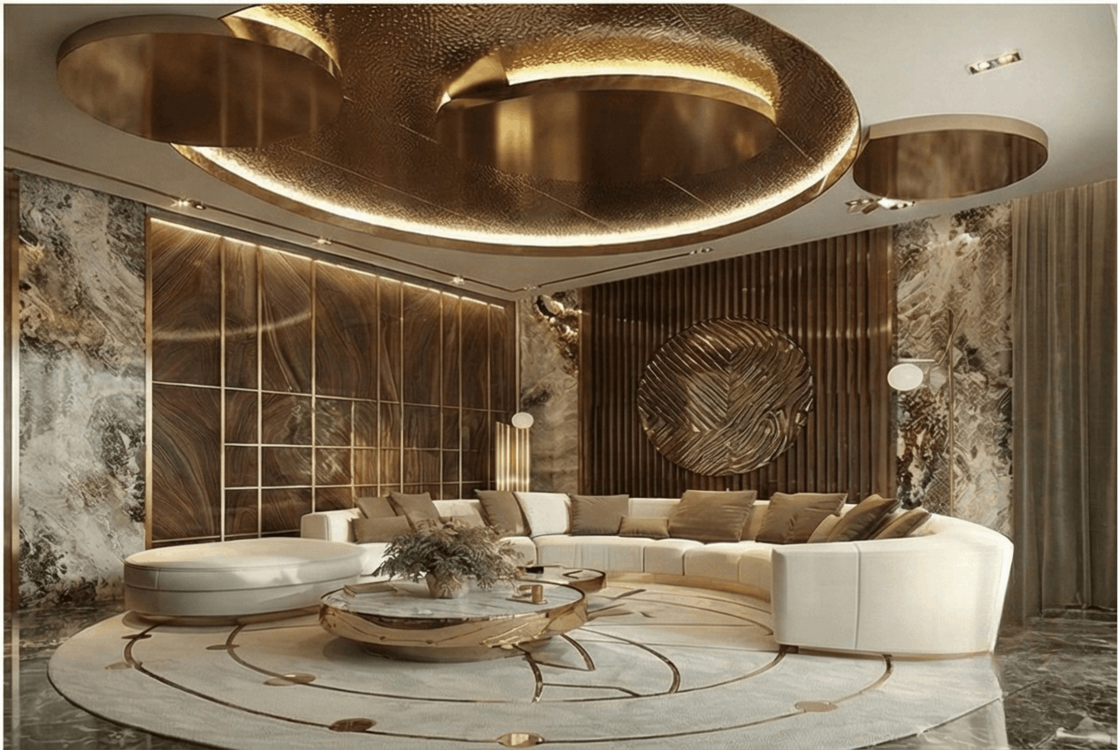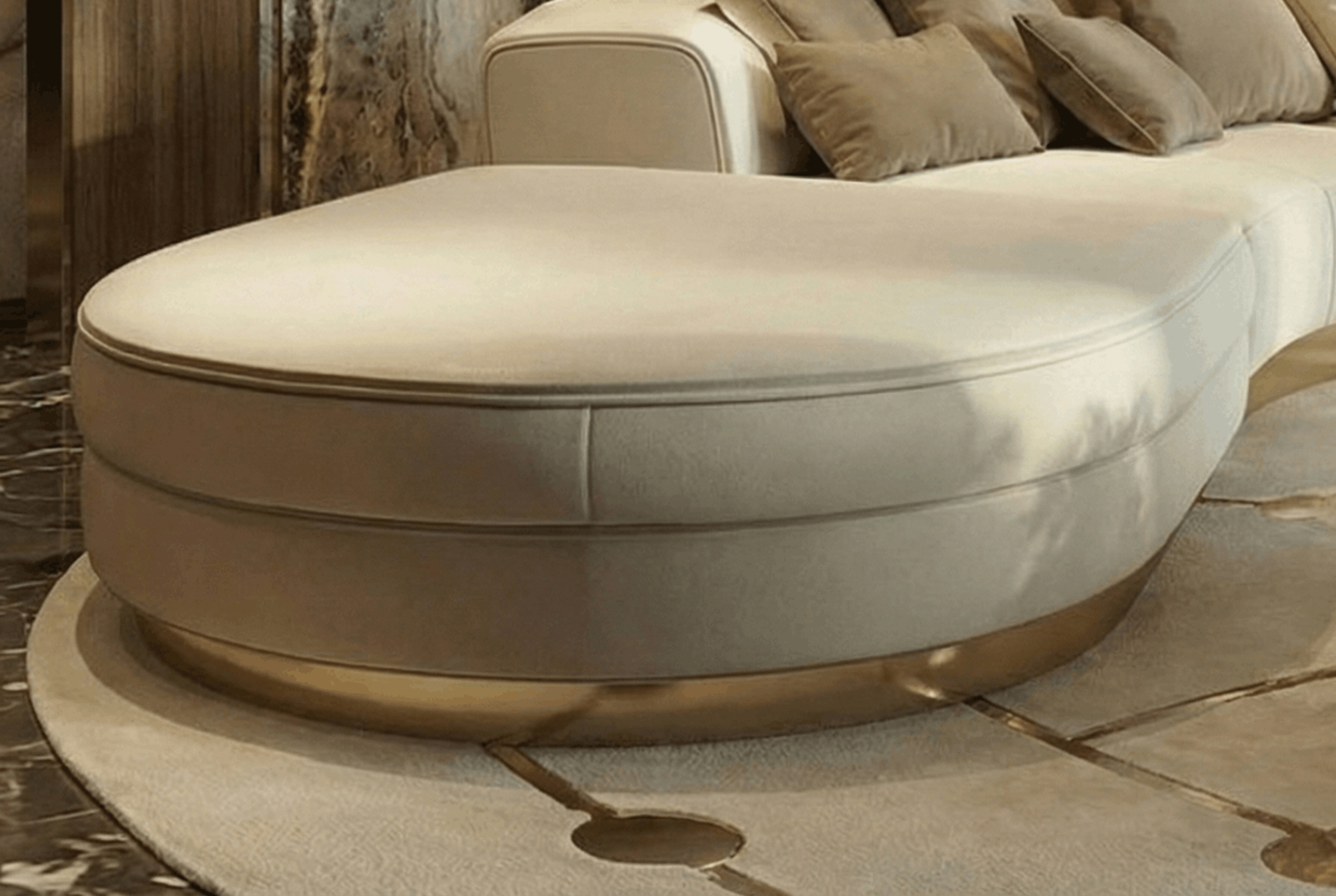 This low marble table anchors the circle and keeps the center clean. The brass surround adds a clear edge and reflects light, making the table feel present without becoming heavy.