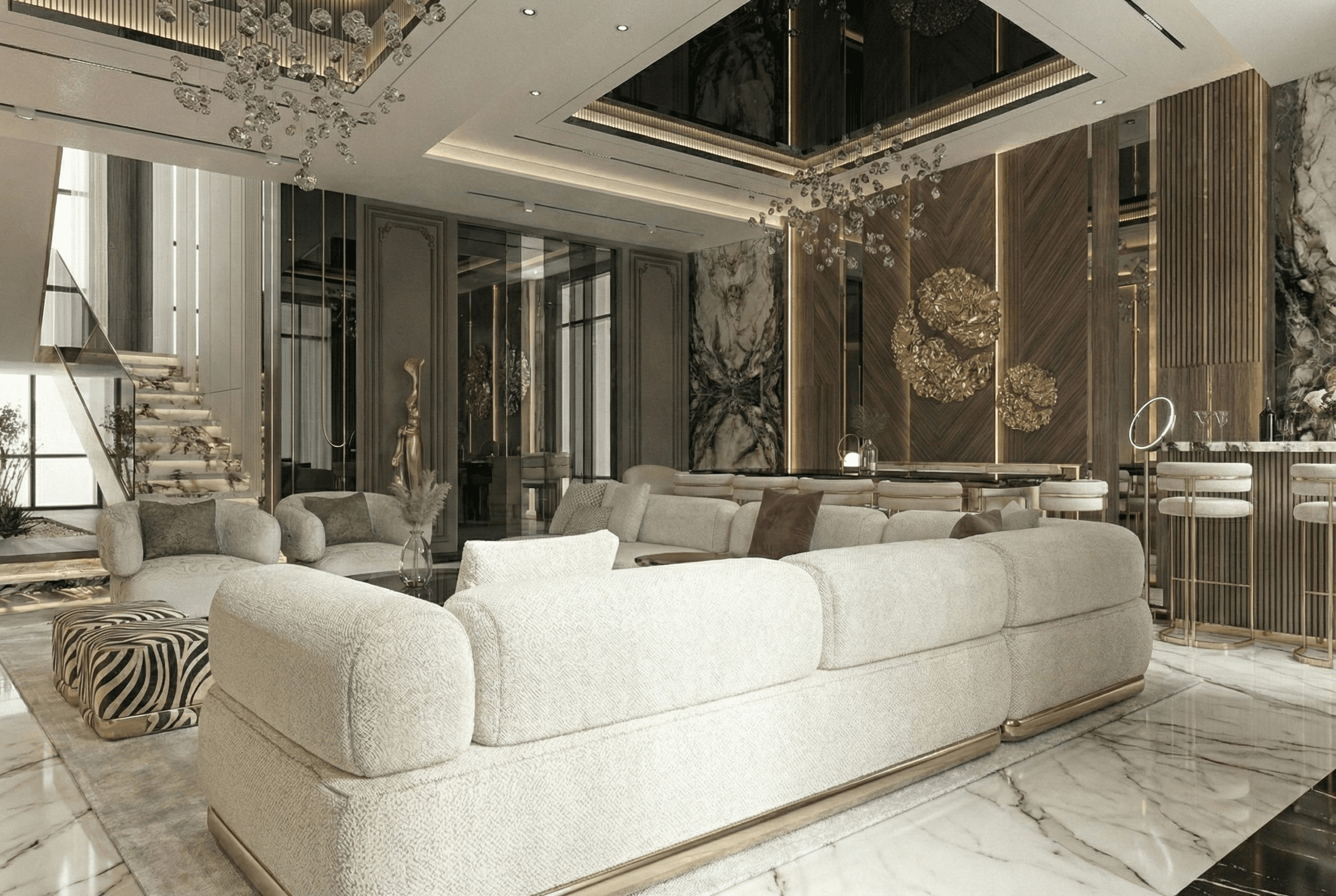The ceiling recess and crystal lighting define the seating area without adding visual weight.