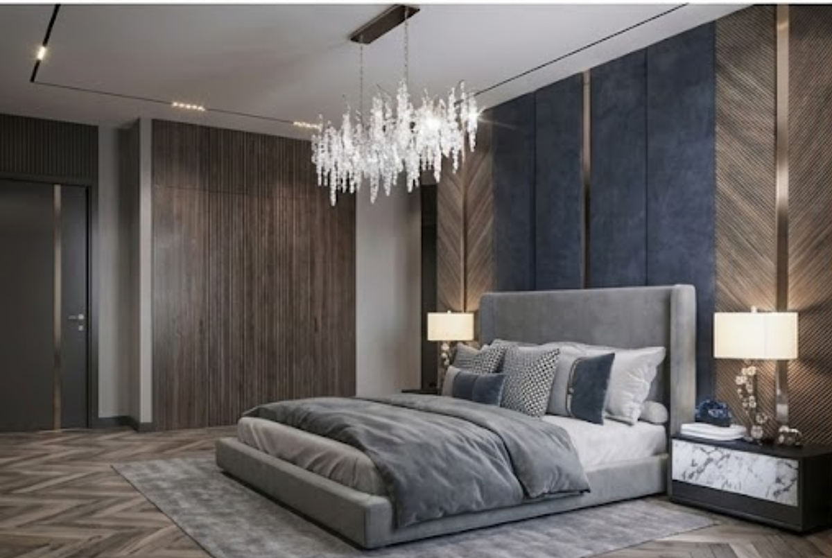 A centered layout with generous proportions, designed to feel grounded and open. The composition focuses on symmetry and depth. Upholstered panels soften the architecture while wood detailing adds rhythm and warmth. Lighting is integrated rather than decorative, allowing the materials to remain the focal point.