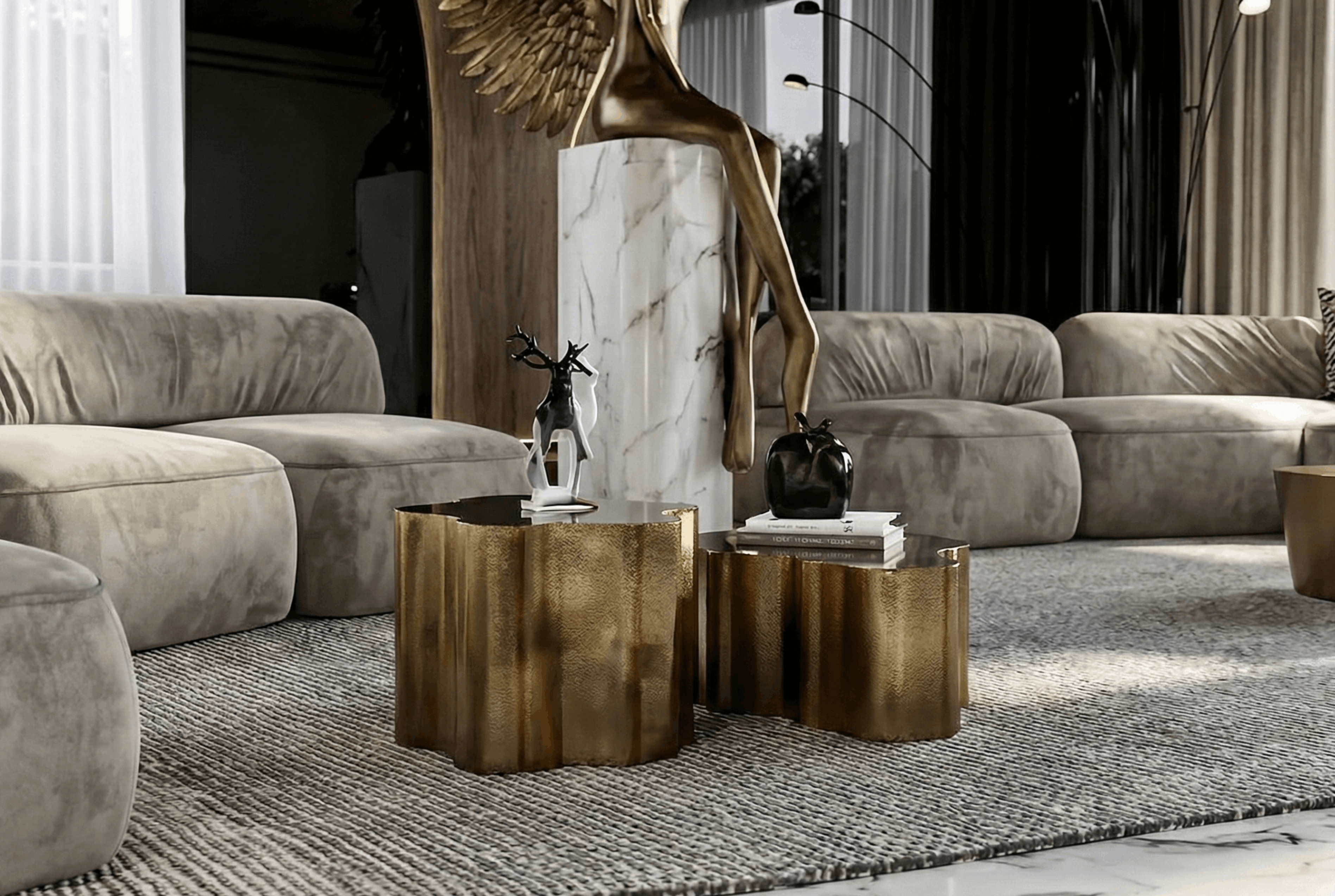 These nested brass tables add function and shine at the center of the conversation area. Their compact footprint keeps the floor plan open, while the textured metal surface catches light and adds depth against the soft upholstery.