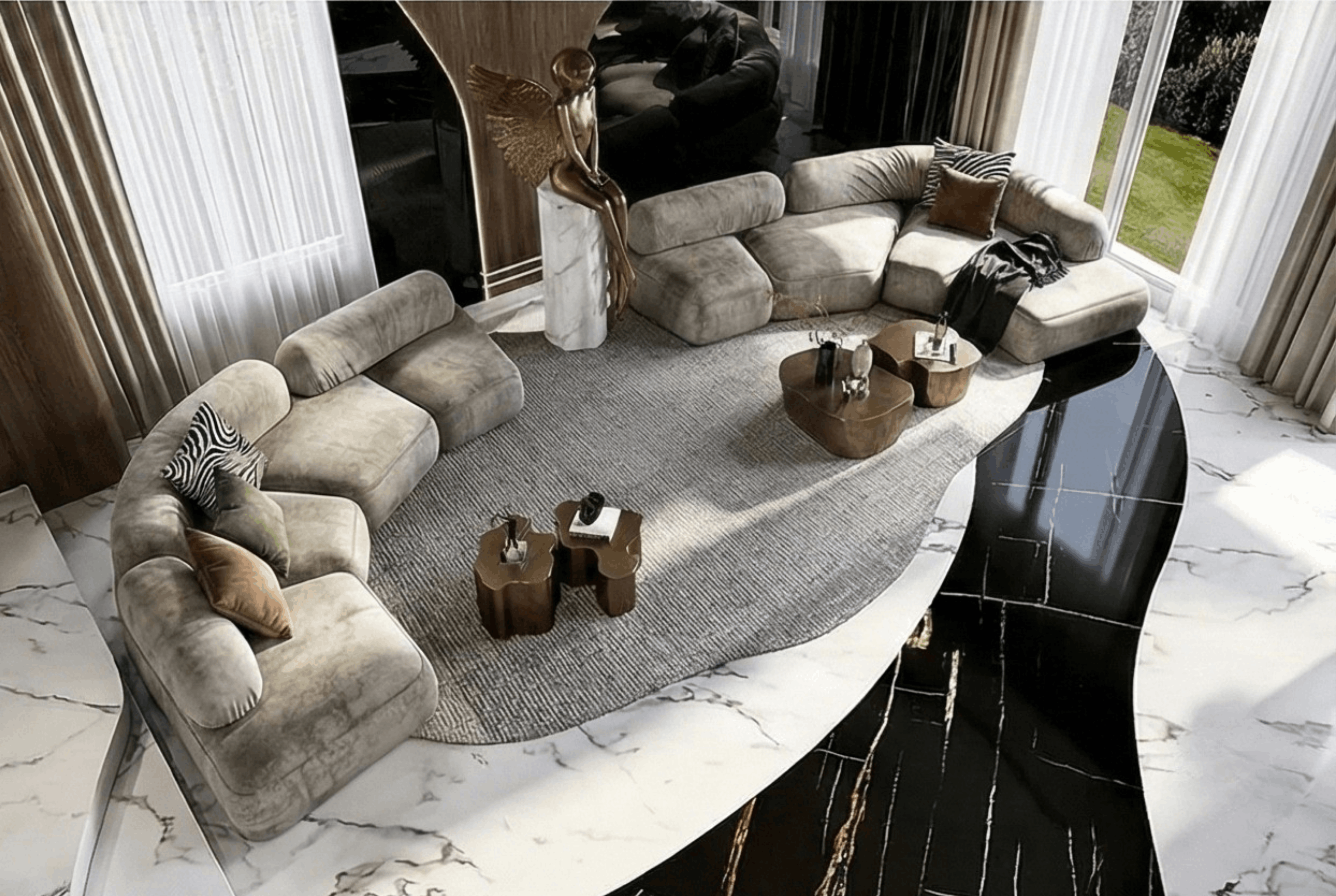 The curved rug edge and the stone inlay guide movement around the seating zone.