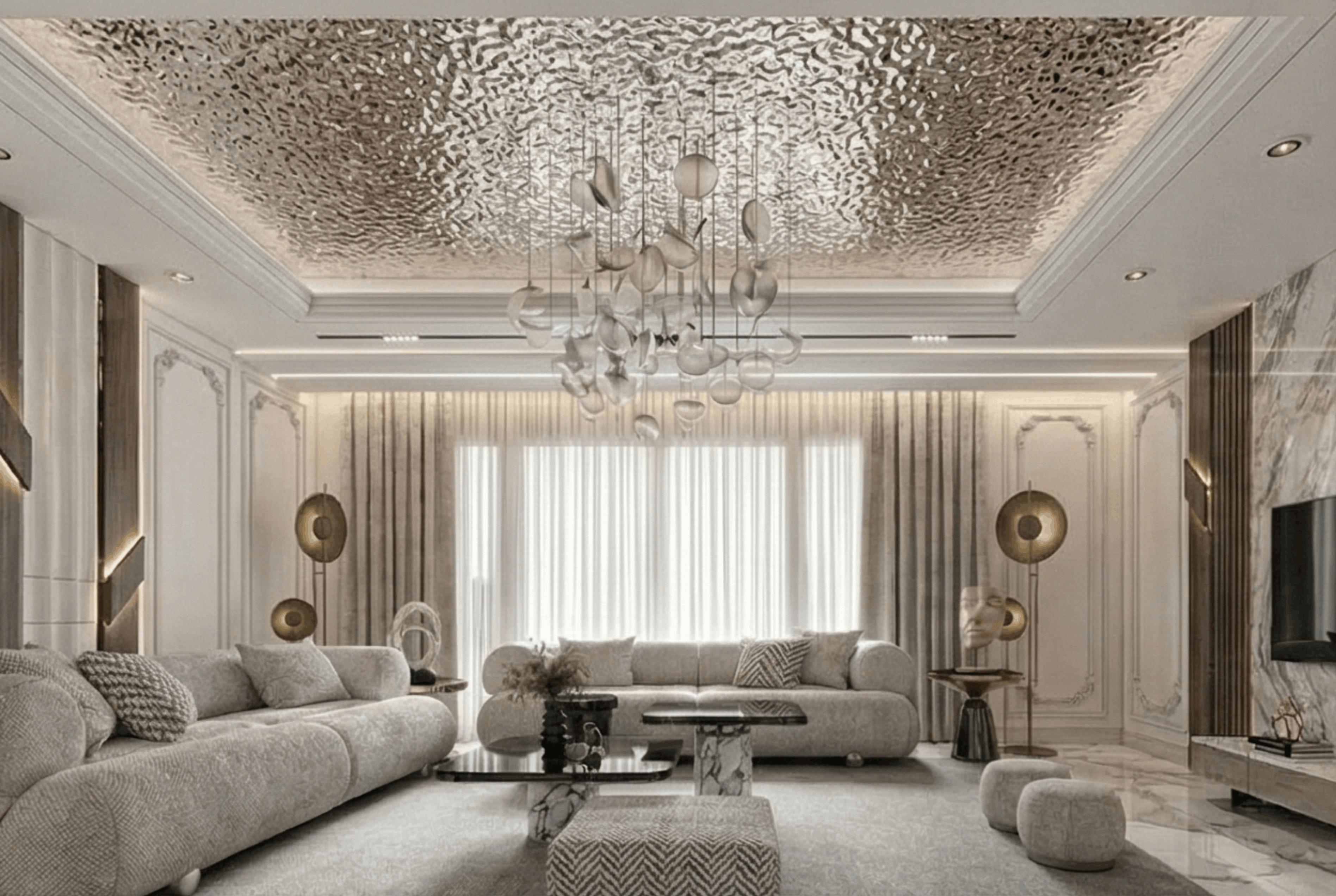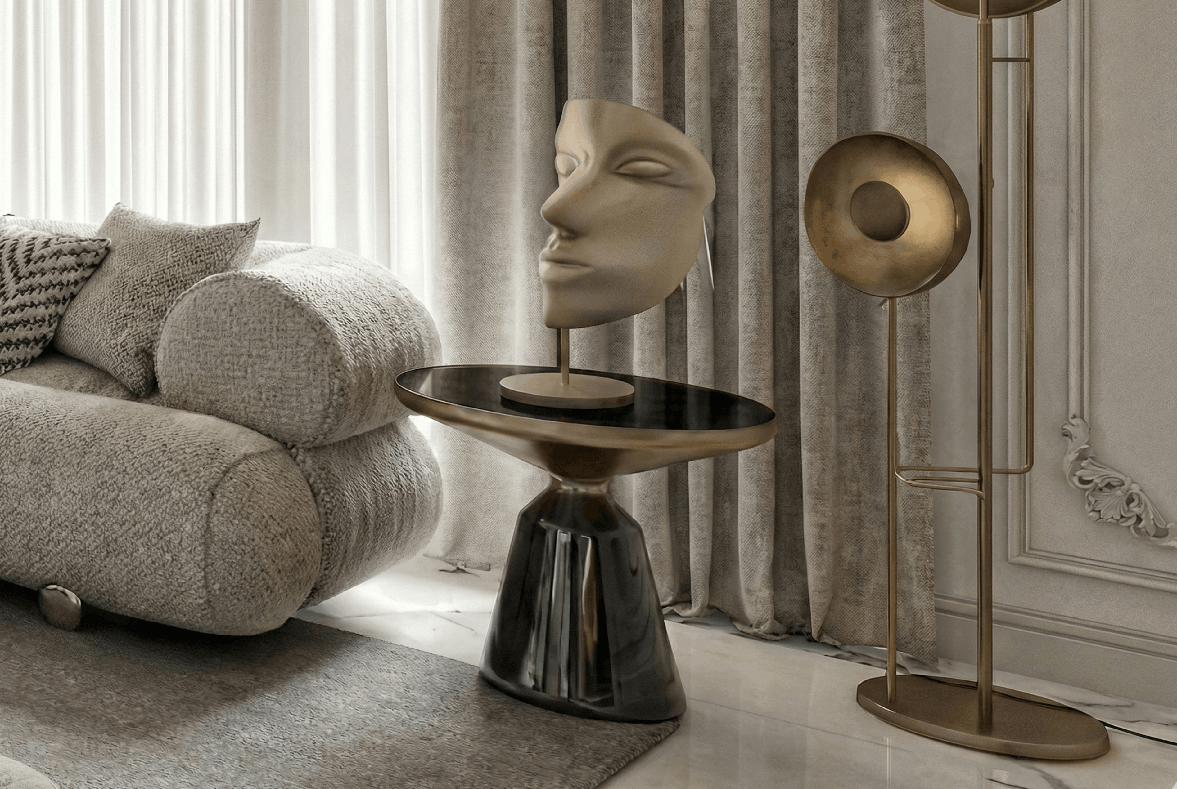 This side table creates a strong point of contrast next to the soft sofa. The dark base grounds the piece, while the brass rim and glass top echo the room’s metal accents and keep the corner functional.