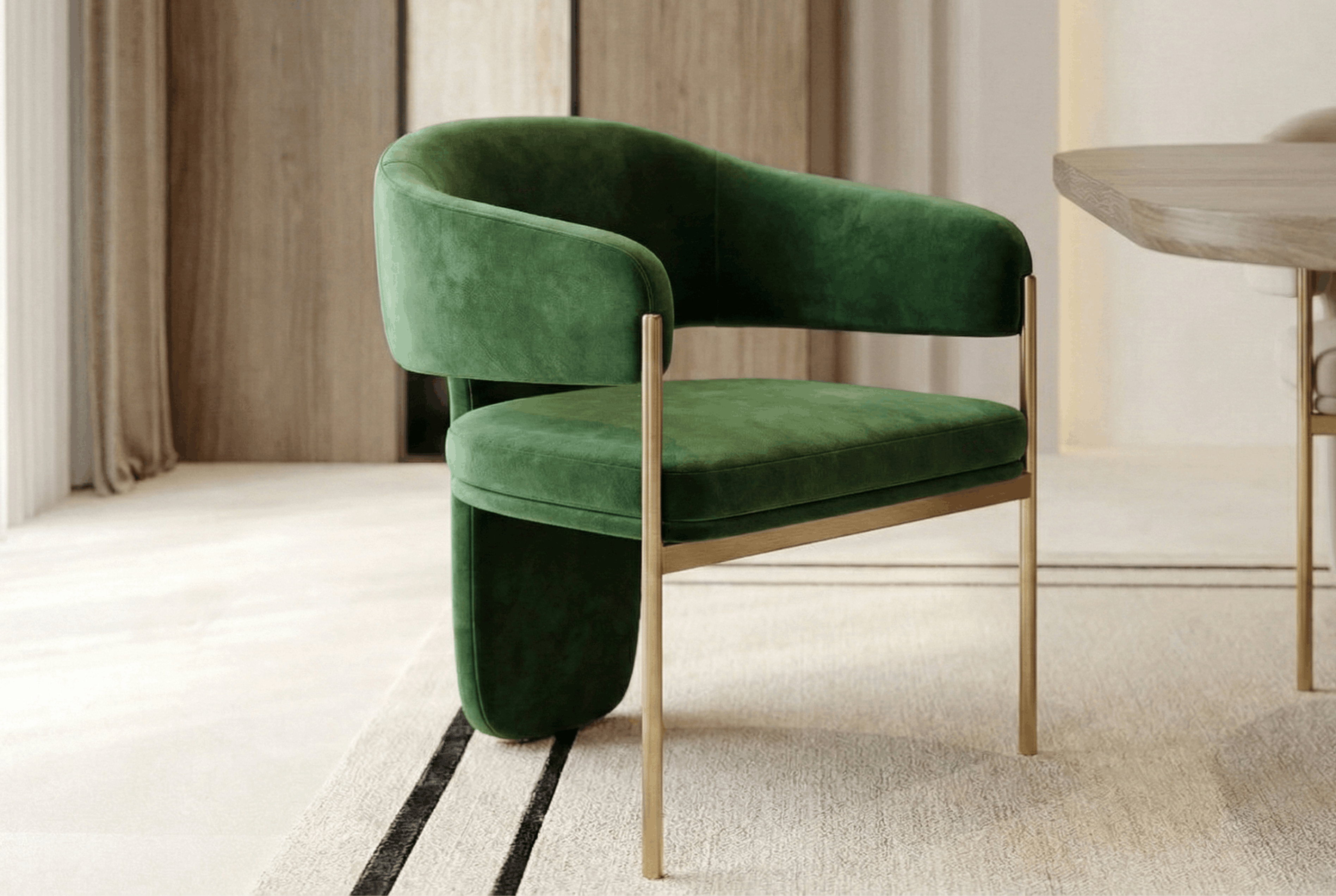 The green velvet accent chair brings an unexpected jewel tone into the composition, its curved silhouette and brushed brass frame adding a touch of vintage glamour. Positioned at the head of the table, it elevates the host's seat while maintaining harmony with the room's overall aesthetic.