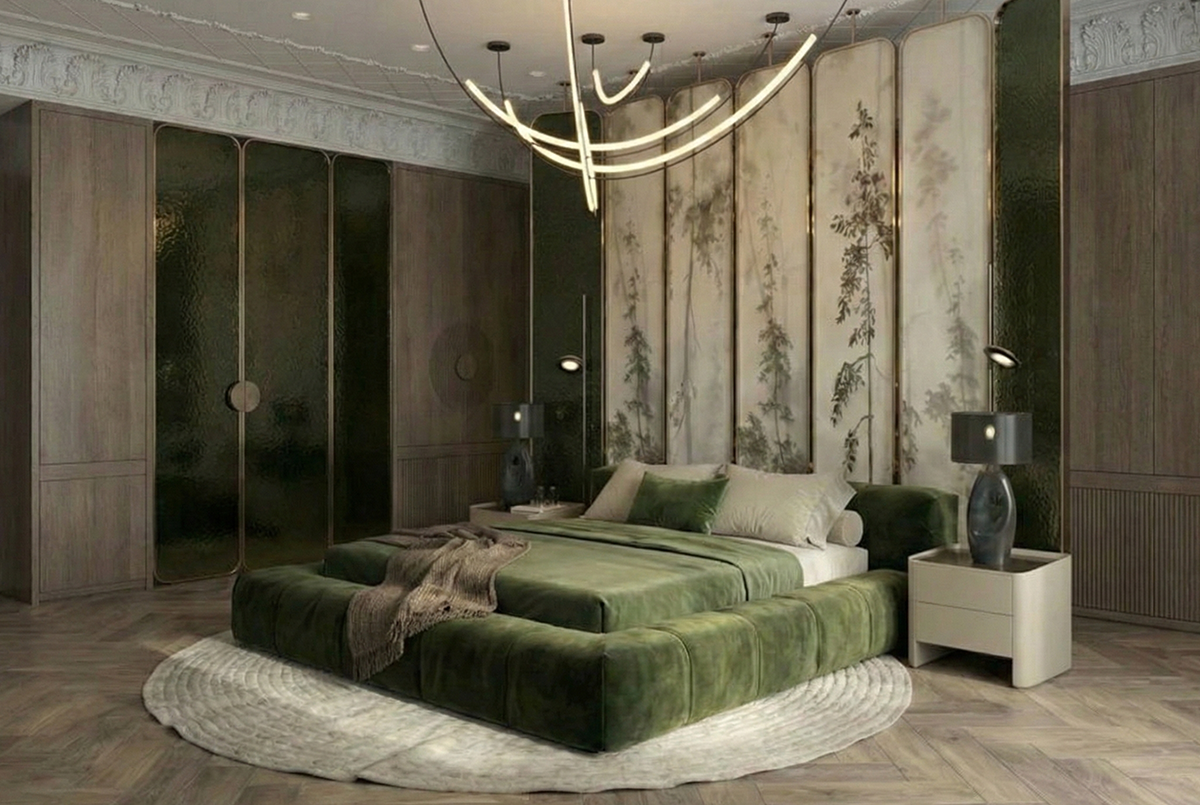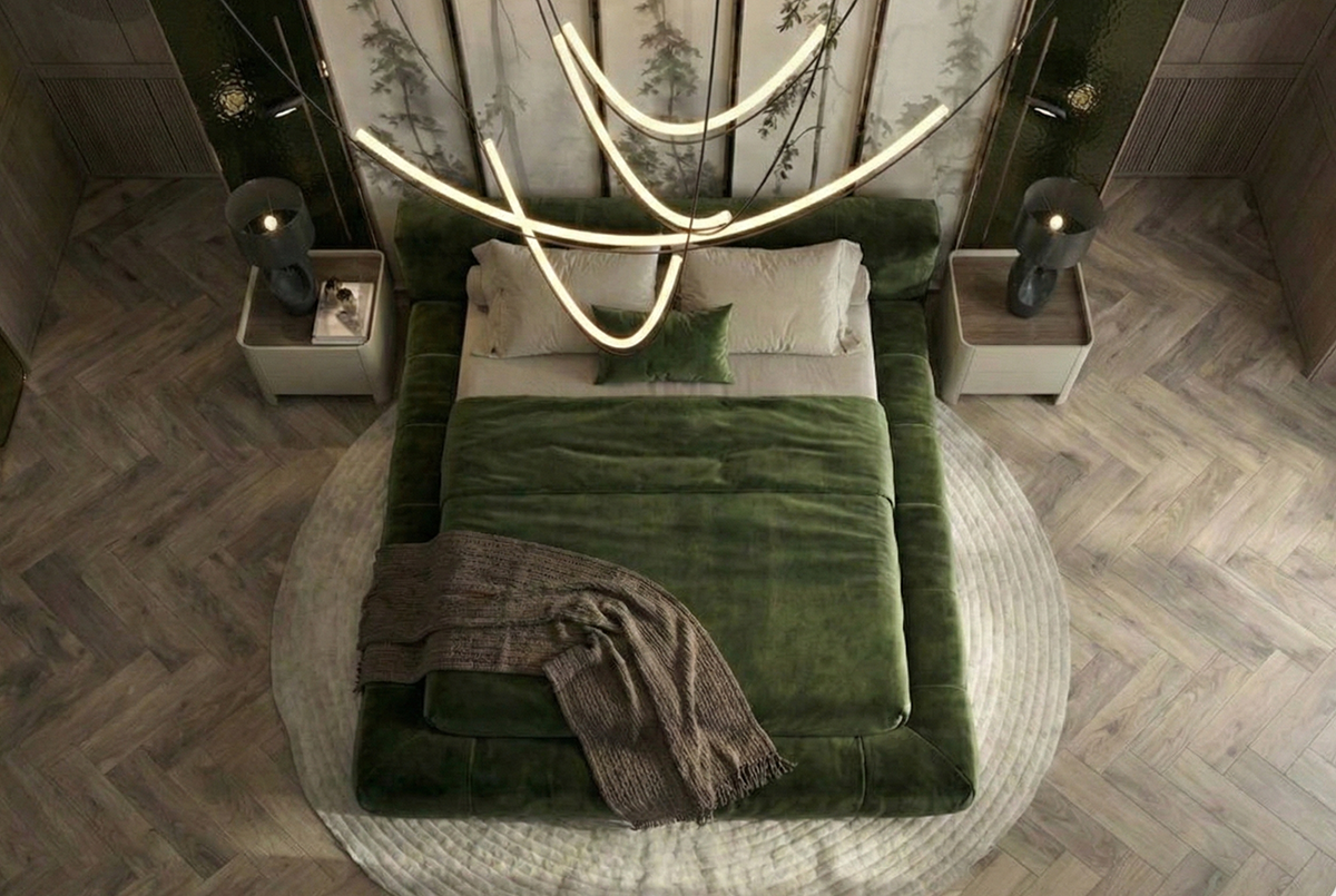 The fluted nightstand adds texture and rhythm, balancing the softness of the bed with structured lines and quiet contrast.